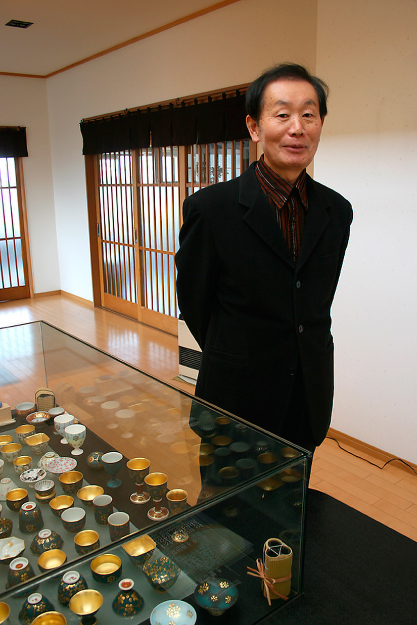 At the end of December, I visited his gallery in Komatsu city. “Something difference from what you imagined?” He asked me with a smile as soon as I first met him. “Aaa… kind of.” I answered honestly, showing him the copies of his website pages which I had printed, containing his picture. “Ah, that’s an old picture, I was much younger! Haha…” He was franker than I expected and never conservative. “Why me?” He was wondering why I picked him for this article, even though there are other Kutani-Yaki lines and artists. “Because I love the Ao-Chibu line.” I said immediately.