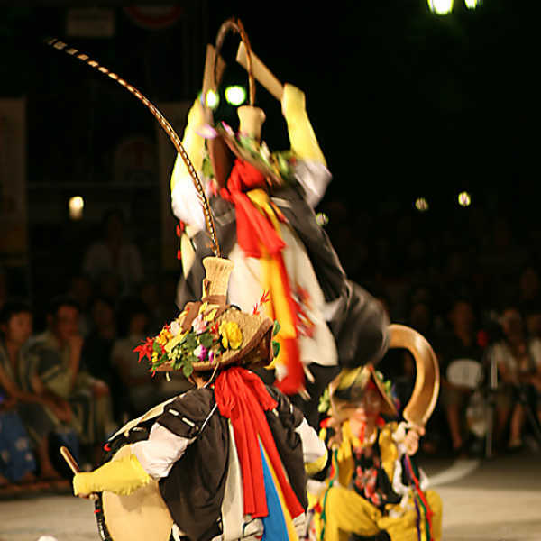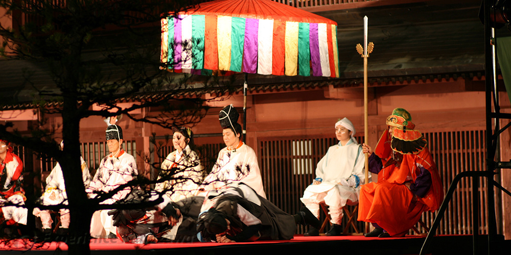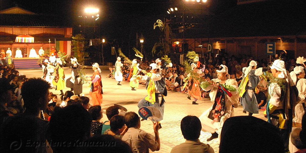 We followed a staff at the free parking lot, then transfered to a free shuttle bus there. I knew we were bit late, and the dance was already started on the street in the heart of the spa town. The stage was lightened up, and people in bizarre costumes were hopping. Some were grabbing bamboo twigs. - I recently found out they were the dancers who disguised as crows. - "Wow! I have never seen those dances!" The typical festivals in Ishikawa, which have their long histories, are mostly at fishing villages along the coast, but those are not dancing. The story about the legend in this spa town is significantly choreographed by the renowned Kyogen performer. It's very fascinating and will make you feel hilarious.