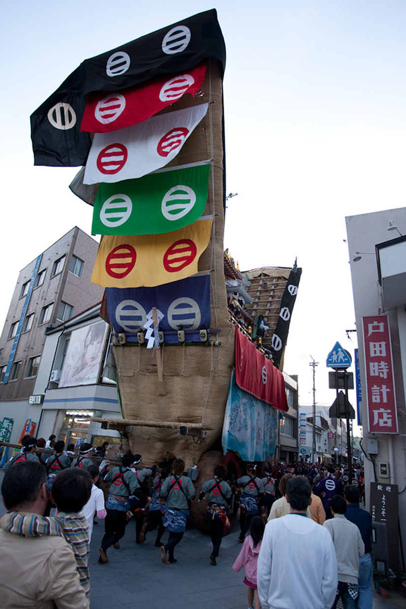The floats called “Deka-Yama” literally mean giant mountains. It’s not hard to understand why, with a height of 12-meters and a weight of 20 tons. However, it can be moved faster than we may think, especially on the straight (yet narrow) streets! How can they drag these huge objects? Well…the local team members (including women, somewhat of a recent addition) pull it by ropes. In addition, visitors (including tourists) also can join in the fun! One of the highlights is to watch their incredible technique called “Tsuji-Mawashi”, used to change direction when they turn the corners. They raise one of the wheels by a huge wooden lever called “Oh-Teko”, with the giant float leaning to change direction. Although it’s pretty primitive, you’ll see the power of human unity!