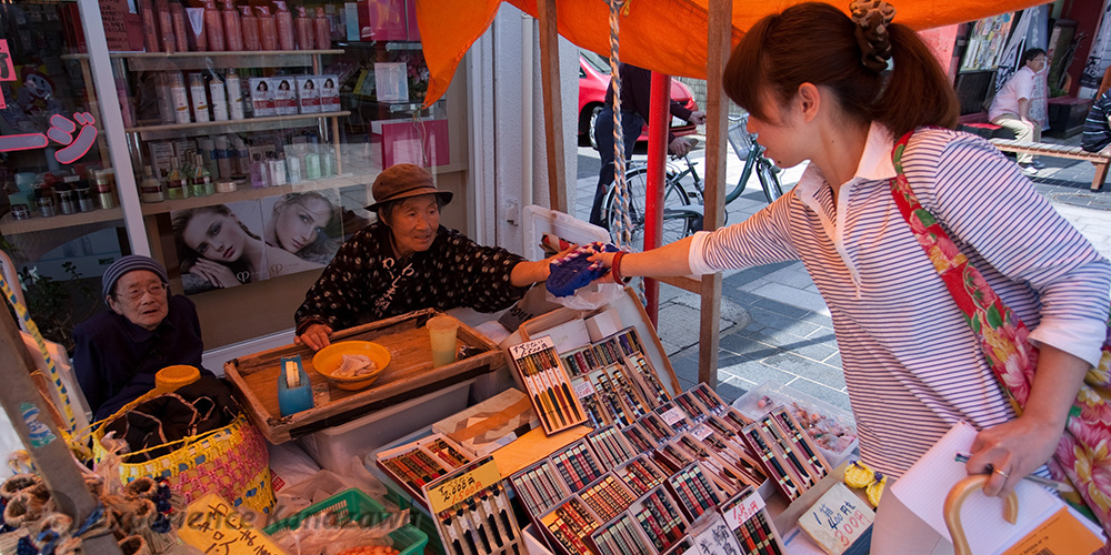 Another interesting shop I recommend you to visit is “Tezukuri Suzuki.” It's funny, the shop owner always wears a golden Mohawk wig that makes him look like the famous Japanese animation character “Super Saiyan.” Don’t forget to take pictures with him! He loves it! There are tons of T-shirts sold in the shop, and those are all designed by his daughter. Amazing! They sell not only T-shirts, but also many Japanese style goods, such as Kaga Yuzen handkerchiefs. There are so many unique stuff waiting to be found by you. Also, if you play your cards right, you will be successful in negotiating with the Super Saiyan for a small discount.