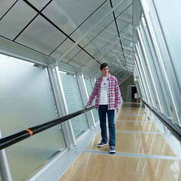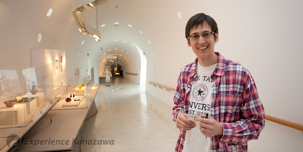 From here I backtracked to a hall jutting off to the left a short way up the corridor. This next hallway has a more angular feel and features large windows above and to the sides with the ceiling and walls at odd angles that make you feel like you’re tipping over. Not to worry, there’s a wooden lacquered handrail to help you keep your balance. Today, I learned for the first time that this handrail was designed specifically to incorporate lacquer-ware into the museum as it is one of the traditional crafts Ishikawa prefecture is famous for. A nice touch, that.
