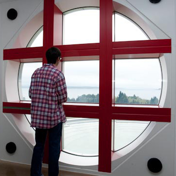 I stopped at the landing midway where there is a large cloudy circular window crosshatched with two vertical and two horizontal red wooden beams.