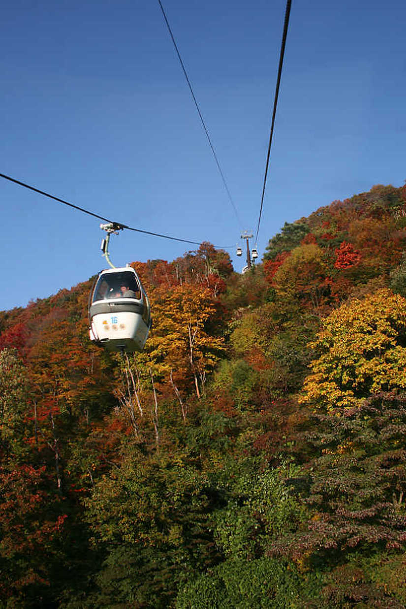 Time for our gondola ride to the top! They drove us and our equipment to the station, where we bought a one-way lift ticket. The gondola was backed up with people there to view the autumn leaves, who gave us and our huge chair bags curious stares. On our way up we were treated to a beautiful panorama of red and yellow foliage, and the pulsing adrenaline fed our natural high. “Who wants to go first?” Asked the female instructor at the top of the gondola station. We nominated our friend, Perla! Her fear of heights made her a tough sell, but we managed to talk some sense into her.