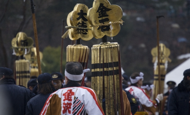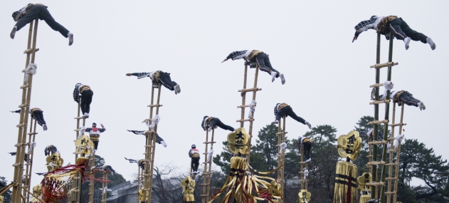 The Kaga-Tobi were a group of firefighters working for the Kaga lords during the Edo period. They climbed ladders to put out fires as quickly as possible. This tradition continues with Kanazawa’s own highly skilled firefighters, who perform death-defying feats from 6-meter-ladders in order to celebrate the New Year.