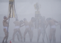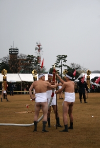 Each firefighter was wearing only a loincloth, a pair of Jika-Tabi (rubber-soled Japanese socks), and a headband! They must have been freezing!!! A few firefighters came out; holding onto one hose. They have to be strong, since it’s rare for the hoses to get loose due to the water pressure. Well… it’s show time!