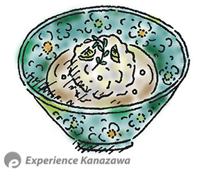 Kaga-renkon is one of the region’s indigenous vegetables. Hasu means lotus in Japanese, and the lotus root is utilized for the dish. A mixture of minced lotus root and the white of an egg are steamed with some mushrooms, chopped prawns, sliced lily bulbs, and white fish meat, and then mixed with a thick sauce. The sauce has the slight aroma of soy.