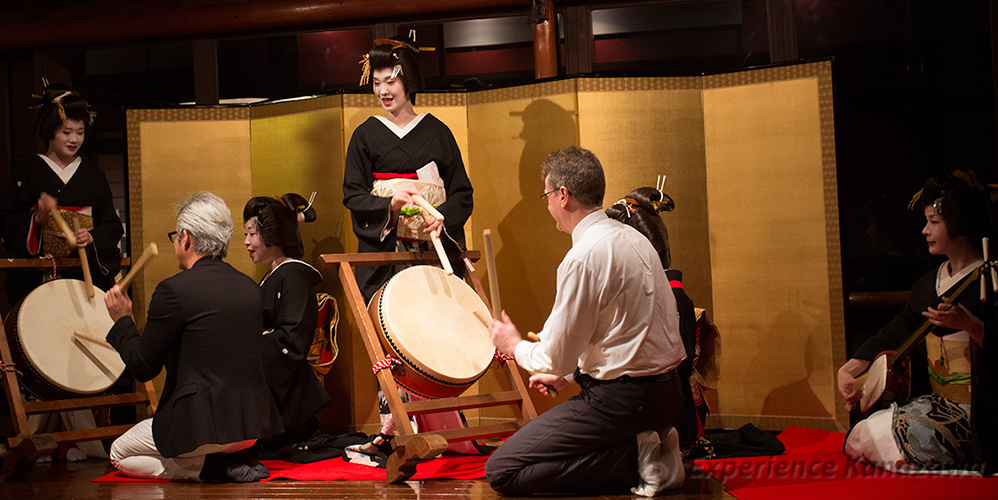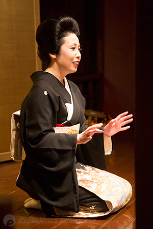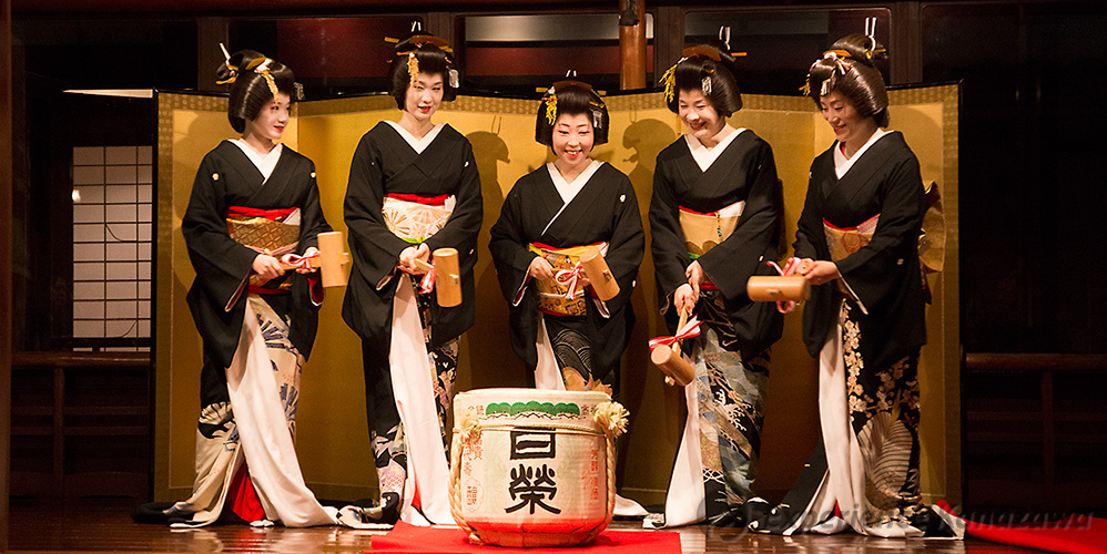 The geisha kicked off the evening’s entertainment by breaking open a cask of sake with wooden mallets. And it was a good thing, too. A Japanese winter meal is just not the same without a little flask of warm sake. With a raised cup and a hearty “kampai” to my neighbors, I knocked back a couple of belly-warmers. A “splendid feeling” was indeed starting to flow through me. Just then, the geisha started their dance performance, accompanied by a single geisha playing the shamisen, a traditional stringed instrument.