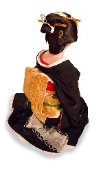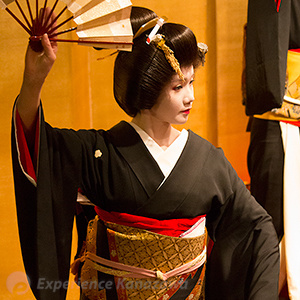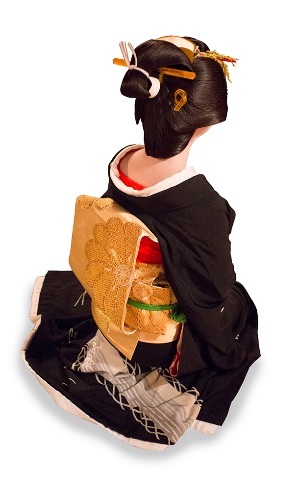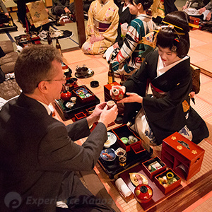 Kneeling or sitting on our comfortable cushions lined up against the red and blue painted walls of the large Japanese-style room, gazing hungrily at the gorgeously prepared meal laid out before each of us, my fellow guests and I beheld the spectacle that we had all come to see: five Japanese geisha in full regalia, floating like fantastic seagulls across the sea of tatami mats in the center of the room.