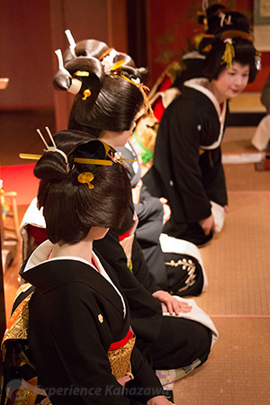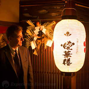 Winter is the season of snow and ice in Hokuriku, the North Country, as this part of Japan is known. And it is also the time for the first of five annual “enyukai,” held at the Kaikaro Teahouse in Kanazawa. Enyukai refers to a kind of evening party with geisha in attendance. It was my first time to have such an experience, and I was looking forward to it with great anticipation as I walked through the snowy streets of the Higashi Chaya District, a historic area of teahouses that used to serve as a playground for samurai and others males of the elite classes. Finally, I found the large paper lantern that marked the entrance to Kaikaro. With the help of my host I was able to read the three Chinese characters painted in black on the lantern—kaikaro, in my best cartoon English, becomes something like “House of Splendid Feelings.”