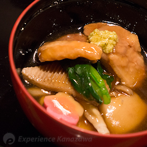Returning to my seat, I found dessert waiting for me in a large two-tiered bowl. Removing the lid, I was surprised to see that it contained—gold! That’s right! The top bowl was full of sweet molasses covered in a solid layer of gold leaf. Setting it to the side, I found the bottom bowl contained noodles of “kuzukiri” (a kind of tuber) on ice. The idea is to dip the noodles in the gold-covered molasses before eating them.