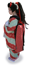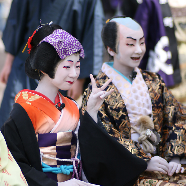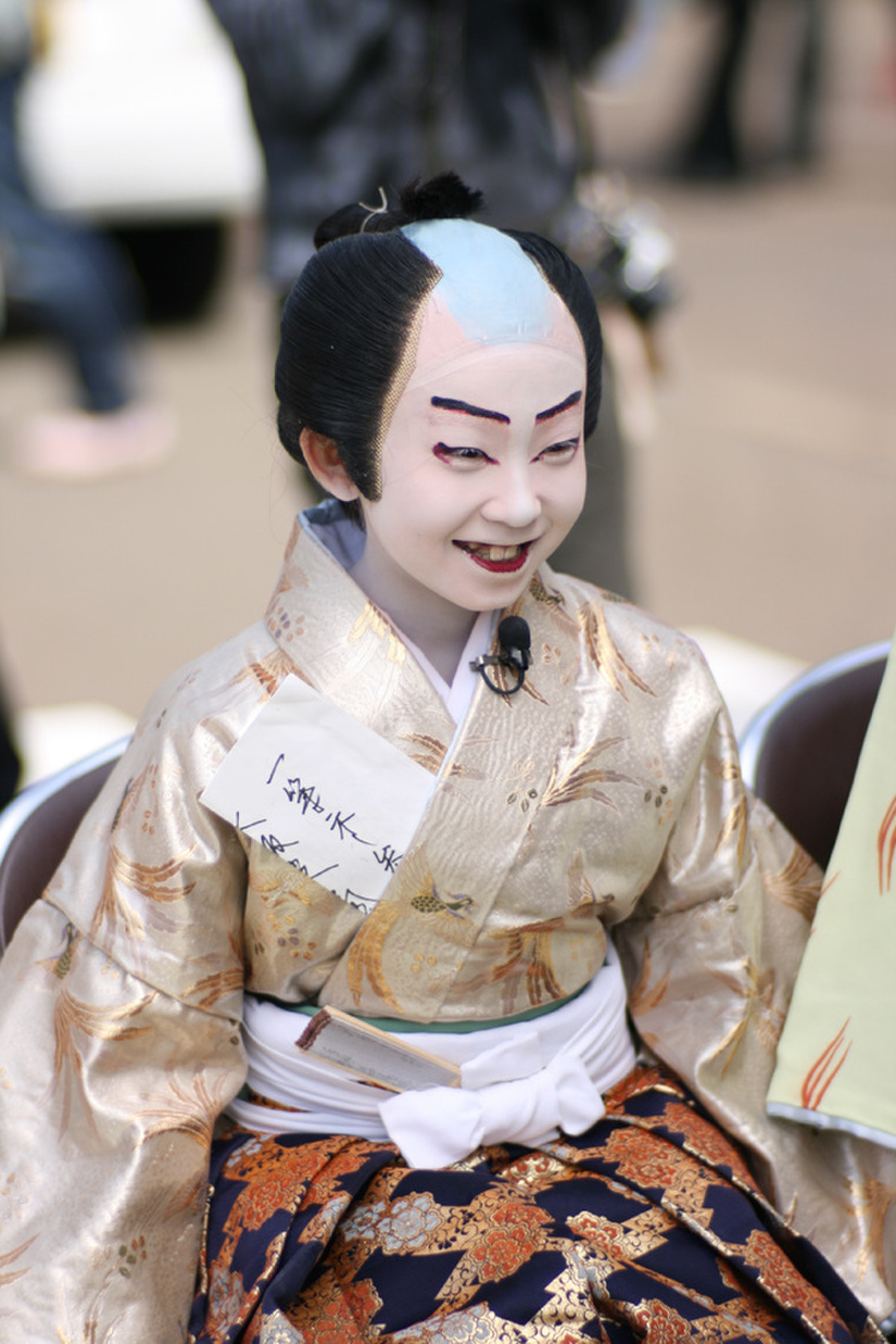 Before the play started, I went to the back of the float to see the kids. They were beautifully made-up and waiting for their performance on the chairs. I heard about a photo competition for next year’s poster. No wonder why lots of older people with fancy cameras couldn’t stop shooting pictures of the photogenic objects. To my surprise, the little Kabuki performers were all girls! It's actually a Girls' Kabuki! Wow! I got a copy of the Kyo-Machi's brochure and read the comments in it after the play. They talk so adorably, but also think like a professional actresses! I could understand that they learned how to perform and express each role’s feeling, even thoug they are all under 12, some are just 9-years-old. They are geniuses!
