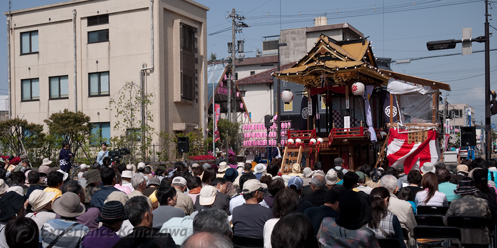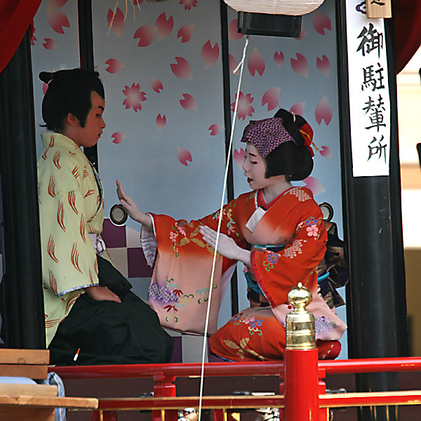 The Ataka-no-Seki in those plays truly existed by the ocean in the city. It's no wonder that Komatsu people love Kabuki. The Otabi Matsuri festival originated from a prayer to God for peace in 1651. Kids' Kabuki has a history of 240 years. Through in the past it was only open to boys to perform the fabulous play! Ryusuke-Cho, Nishi-Cho, Kyo-Machi, Naka-Machi, Tera-Machi, Yohkaichi-Machi, Daimonji-Cho, and Zaimoku-Cho have floats. Two of the eight districts perform every year. This year it was Kyo-Machi and Daimonji-Cho's turn, and I watched "Otoko-no-Hanamichi" in Kyo-Machi.