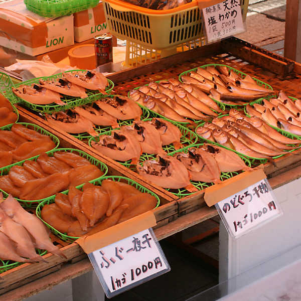 Wajima is located on the tip of the Noto Peninsula. It is nestled by mountains and looks out onto the Japan Sea. It is an agricultural and fishing city. Wajima is also well known for its lacquerware. Making Wajima lacquerware requires refined skills and time-consuming steps. The art of lacquerware has been mostly practiced by male craftsmen throughout history. Consequently, most women of Wajima are in charge of farming, fishing or other labor-intensive work. One of the more famous professions here in Wajima is 'women under the sea,' also known as female deep-sea diving. Without any oxygen tanks, these women deep-sea dive for conch and abalone. This unique profession has been passed down from generation to generation for centuries. With the men producing lacquerware and the women working outdoors, it was the women who would meet in the mornings to trade or barter goods to secure whatever they needed. This is how the original Wajima market came into being. This 1000-year-old tradition continues today, and the Wajima morning market is one of the most famous and oldest morning markets in Japan.