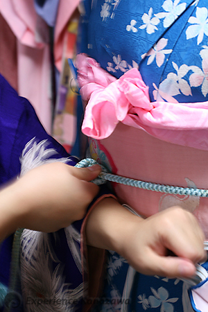 As I’m listening, asking questions and holding kimonos up to myself in front of a mirror she would add in her opinion as to what she thought looked nice on me, but in true Japanese fashion left the decision entirely up to me. Finally, after some humming and hawing I decided on this gorgeous blue and pink one. Just when I thought the hard part was over we had kimono “accessories” to pick out as well.