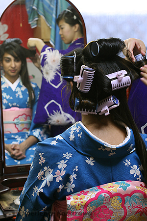 Finally, it’s done. I do a once around in the mirror to take in this new sight of myself. I feel incredibly famine and regal.Just as I am admiring the craftsmanship I was taken to the back of the shop where I am sat down in front of a mirror and asked to choose which hair style I would like. Beaming from ear to ear I eagerly browsed through the pictures of up dues and carefully imagined which would look the best with the kimono. Hair is generally kept up when wearing a kimono as the nape of the neck is considered visually pleasing. The hands and back of the neck are the only skin seen when wearing a kimono. That is why it is important when putting on a kimono that the collar is deep set and wide in the back. This can be done with clothes pins holding the back collar in place until the kimono is fully tied and one is ready to leave the house.