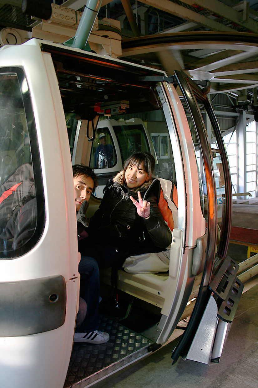 Time for our gondola ride to the top! They drove us and our equipment to the station, where we bought a one-way lift ticket. The gondola was backed up with people there to view the autumn leaves, who gave us and our huge chair bags curious stares. On our way up we were treated to a beautiful panorama of red and yellow foliage, and the pulsing adrenaline fed our natural high. “Who wants to go first?” Asked the female instructor at the top of the gondola station. We nominated our friend, Perla! Her fear of heights made her a tough sell, but we managed to talk some sense into her.