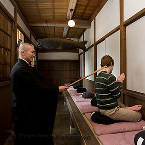 “Kyosaku” may seem scary or like a punishment at first, but it is actually the monk’s way of helping you regain your concentration or get rid of your sleepiness.First put your hands in the gassho position and bow. The monk will make his way over to you and tap your back lightly with a flat wooden stick to let you know his behind you. Then, after you bend your neck to the side, he will swiftly hit your shoulder. When I had a monk demonstrate this on me in a private session, he hit me quite hard and I was surprised, but when I had this done in the actual zazen session, I think the head monk went easy on me. In any case, it is a good way to refresh yourself and regain your concentration if you feel you are getting off track.